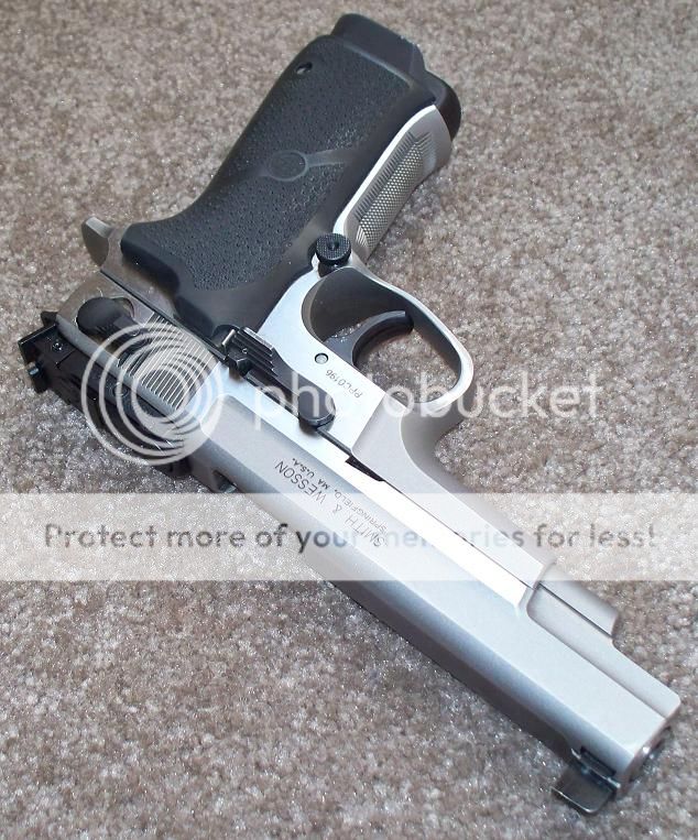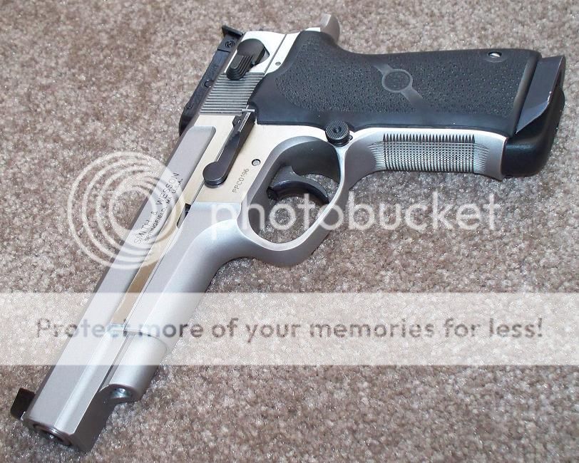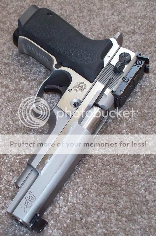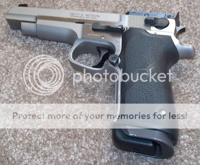 As the name would suggest, this was Smith & Wesson’s PPC pistol and was only available to law enforcement during its years of production. Its based on the 5906 service gun, but meticulously tightened and accurized. The Aristocrat sights are fully adjustable and have a few preset positions as well. The tall front sight is easy to pick up on target. The trigger is extremely light and crisp. Its better than the 952's trigger by a slight margin and even slightly lighter than the 845's trigger, making it the nicest of any of the Performance Center autos. The ugly standard black plastic wraparound grips were changed to even uglier Hogue rubber grips by a previous owner. In addition to that, the safety was changed to a Smith & Wesson ambi safety. Included with the sale were the single sided safety and the original grips, but I see no reason to change back to either. If the grips get changed, it will only be to a nice set of Nills. Other PPC9 features include checkering on the front strap, an extended mag release, and a two tone stainless finish. Like all the vintage PC autos, the PPC has the Briley bushing doing a great job holding things together on the business end.