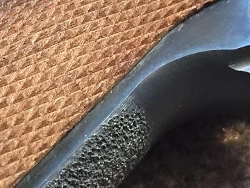 The “Military” designation simply means the grip angle is more upright (like a 1911) than the non-military Hi-Standards, which are more swept back like a Luger. The ergonomics are outstanding. The finely checkered walnut grips with the thumb rest fit my hand perfectly. The trigger and thumb safety are within easy reach and the stippling really keeps the gun from sliding around. The trigger weight is adjustable via a small screw in the back of the slide.