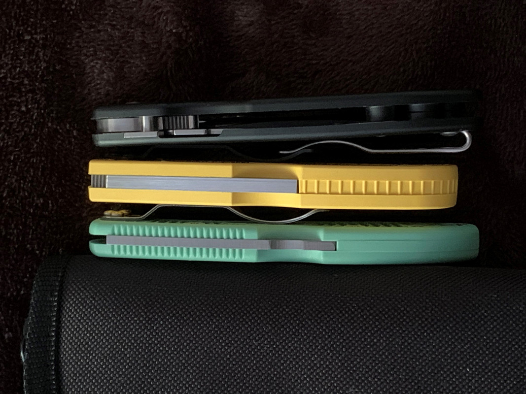 Here are a couple pics I just took of my old Police, a new Buck 110 Slim and a Spyderco Endela (Thin Blue Line model). The deep carry clip of the 110 makes it stick a little lower into the pocket, but the Police sticks up higher, and the top edge can poke into my hip above the belt line when seated. Annoying.